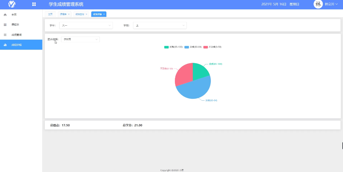 - 成绩详情:可查看自己的成绩详情消息,包括成绩详情图表信息(优秀、及格、不及格占比)和总绩点、总学分,可选择图表形式,支持学年、学期搜索。