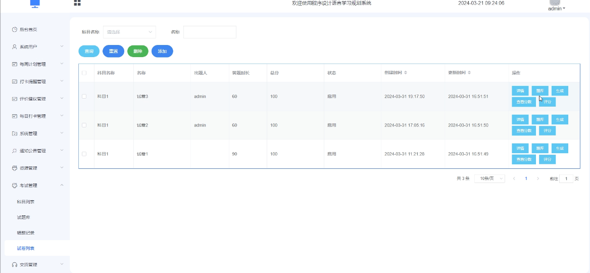 - 点击“试卷列表”,可查看所有试卷列表信息,进行增改删查操作,支持科目名称、名称搜索,可点击查看详情,并可点击题库、生成、查看分数、评分操作。