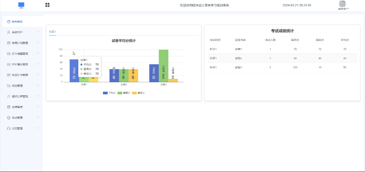 - 后台首页:可查看试卷平均分统计、考试成绩统计等信息数据分析图表。