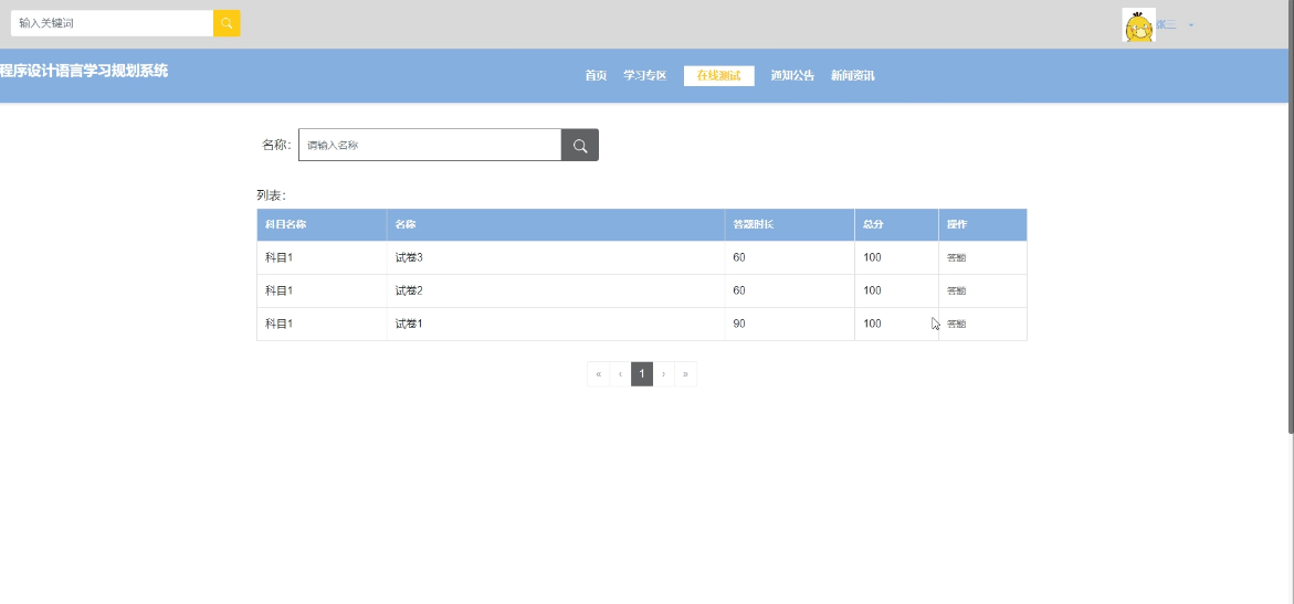 - 在线测试:可查看所有在线测试信息,支持名称搜索,可点击发布答题操作,提交后等待评分。