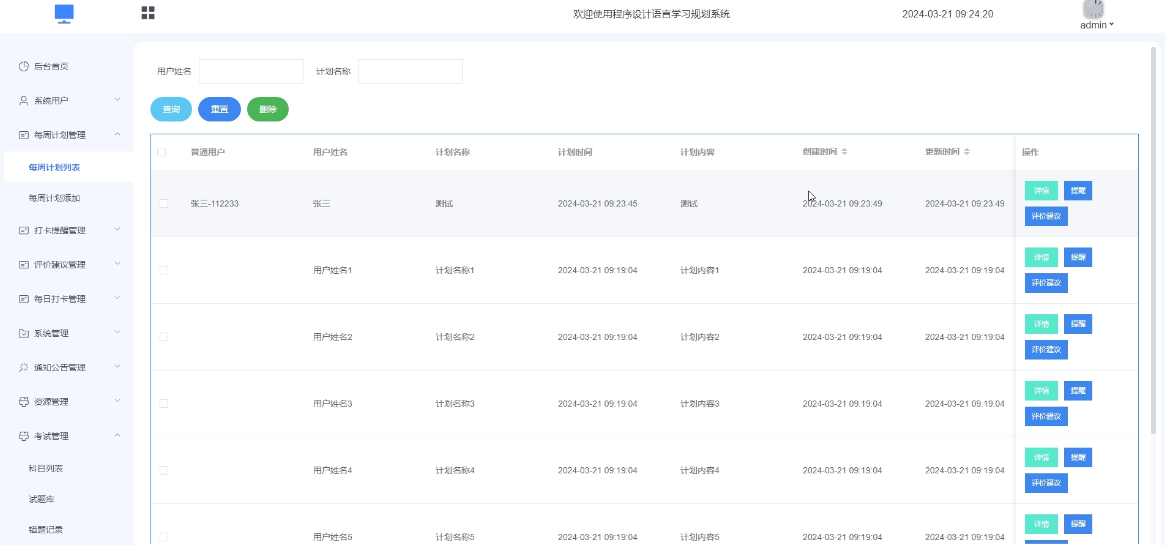 可查看所有每周计划信息,进行增改删查操作,支持用户姓名、计划名称搜索,点击可查看详情,并可点击进行提醒和评价建议操作核。界面如下图所示。