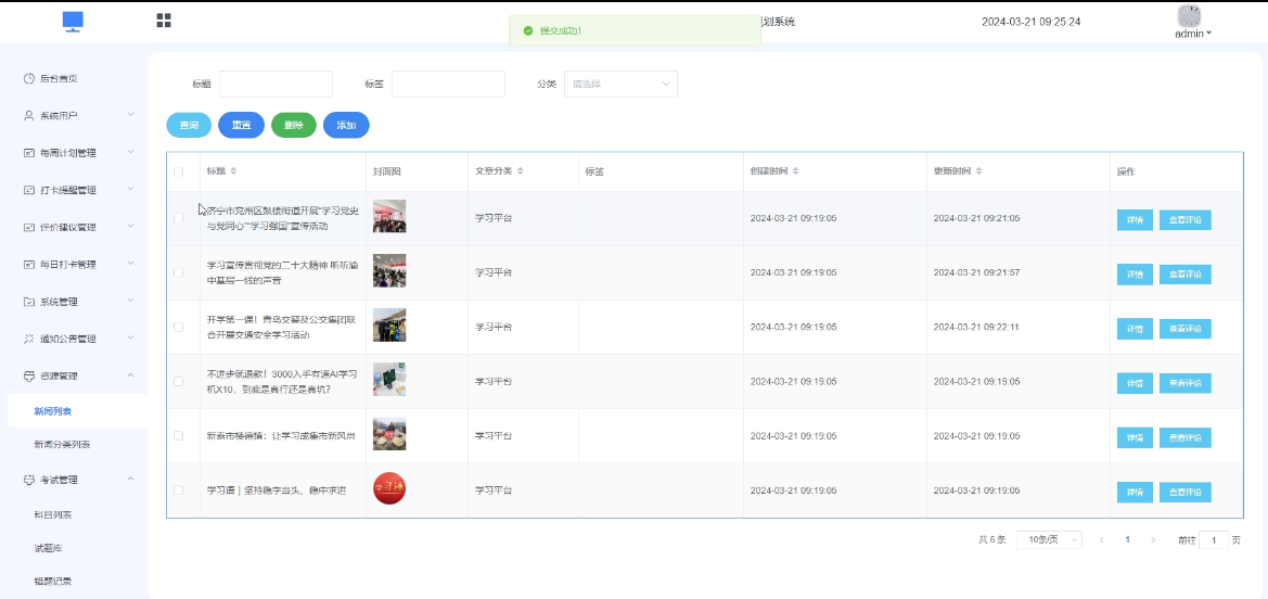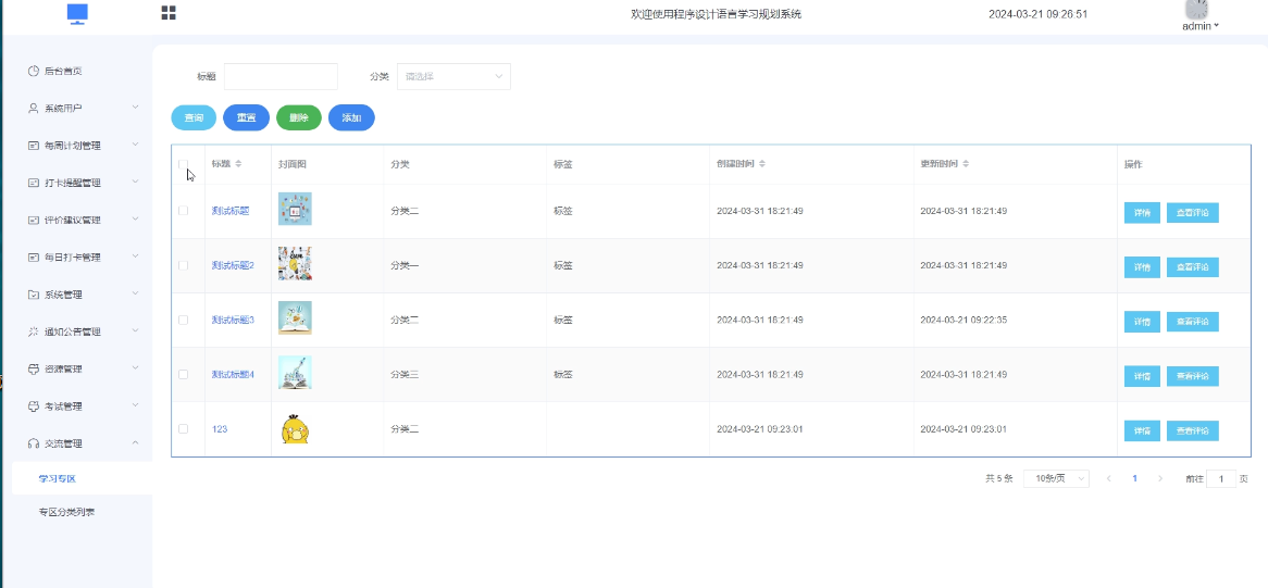 - 交流管理:可对学习专区和专区分类进行管理,进行增删改查操作,学习专区支持标题、标签、分类搜索,可点击查看详情和查看评论;学习专区分类类型名称搜索,可点击查看详情。