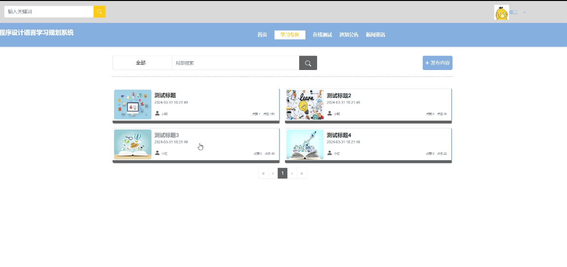 - 学习专区:可查看所有学习专区信息,支持局部搜索,点击可查看详情,进行点赞、收藏和评论,并可点击发布内容操作。