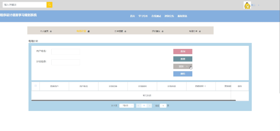 - 点击“每周计划”,可查看自己的每周计划信息,进行增改删查操作,支持用户姓名、计划名称搜索,可点击查看详情;