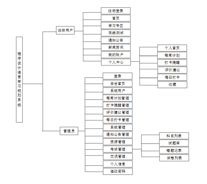 根据基于Springboot的程序设计语言学习规划系统的需求进行划分,主要分为普通用户和管理员两大模块,具体功能分析如下: