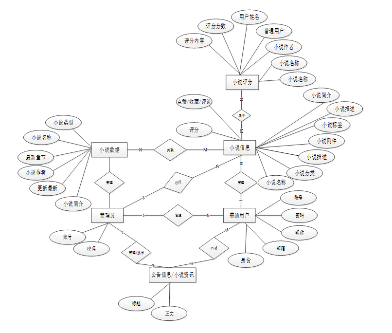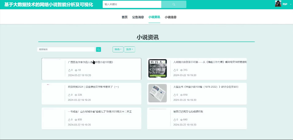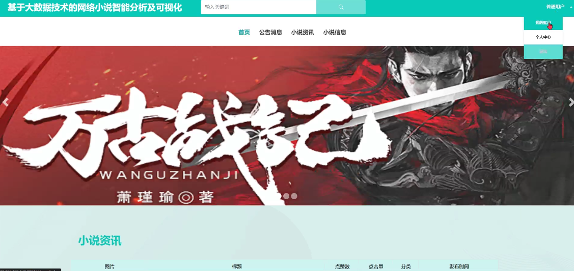 - 小说资讯:可查看管理员发布的所有小说资讯信息,支持局部搜索和下拉(筛选、排序)搜索,热门文章推荐,点击可查看详情,进行点赞、收藏和评论。