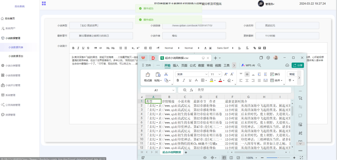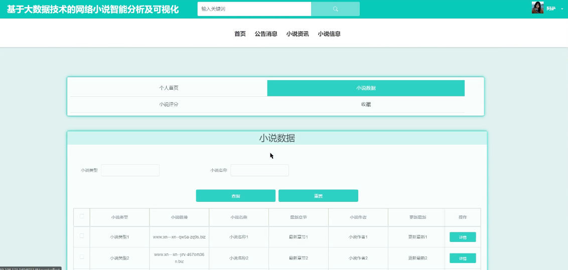 - 小说数据管理:可查看所有小说数据信息,进行增改删查操作,并可进行点击下载导入文档,和点击导入操作,支持小说类型、小说名称搜索,可点击查看详情(小说类型、小说链接、小说名称、最新章节、小说作者、更新最新、小说简介)