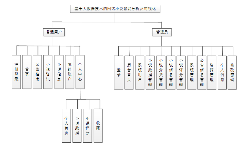 按照基于大数据技术的网络小说智能分析及可视化的角色,系统划分为了普通用户模块和管理员模块这两大部分。