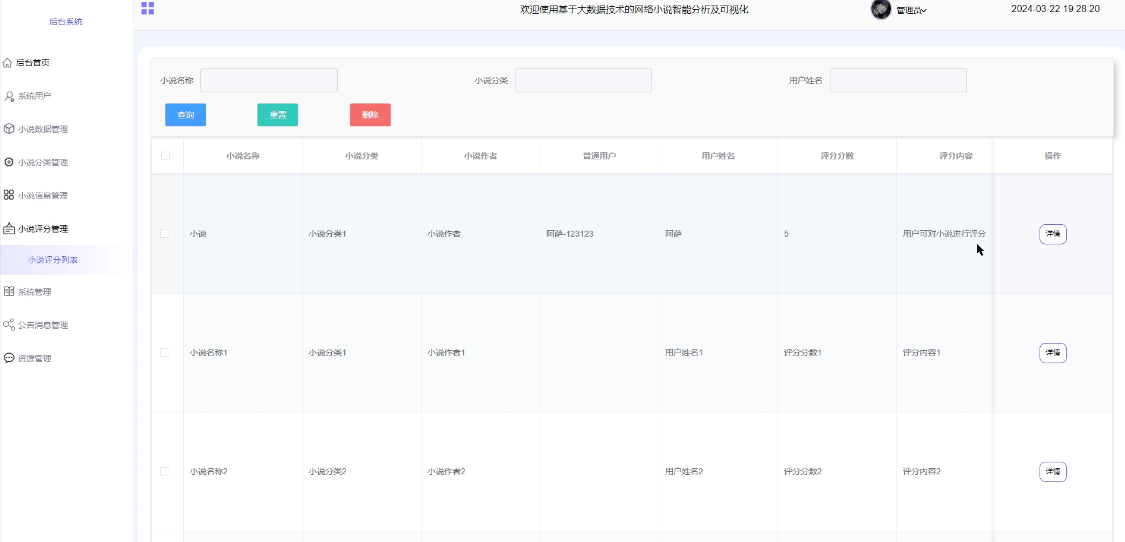 - 小说评分管理:可查看所有小说评分信息,进行查询和删除操作,支持小说名称、小说分类、用户姓名搜索,可点击查看详情(小说名称、小说分类、小说作者、普通用户、用户姓名、评分分数、评分内容)。