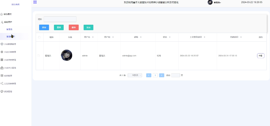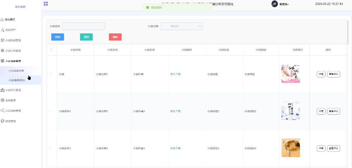 - 小说分类管理:可查看所有小说分类信息,进行增改删查操作,支持分类搜索,点击可查看详情。