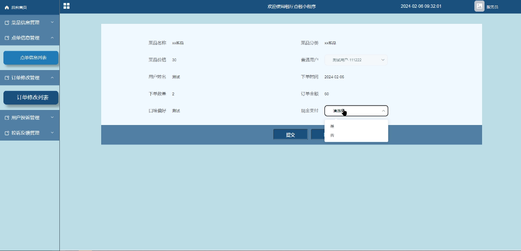 - 点单信息管理:可查看所有点单信息,进行查询和修改操作,支持菜品名称、菜品分类、用户姓名、支付状态搜索,可点击查看详情(菜品名称、菜品分类、菜品价格、普通用户、用户姓名、下单时间、下单数量、订单金额、口味偏好、是否现金支付),可修改用户是否现金支付情况。