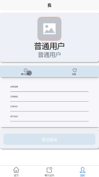 我的:可对基本信息、收藏、点单信息、订单修改、订单评价、用户投诉等信息进行管控。例如: