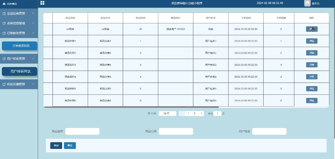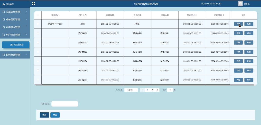 - 投诉反馈管理:可查看所有投诉反馈信息,进行增删改查操作,支持用户姓名、员工姓名搜索,可点击查看详情(普通用户、用户姓名、投诉时间、投诉内容反馈内容、员工姓名、反馈内容、回复内容),对服务员的投诉反馈进行回复