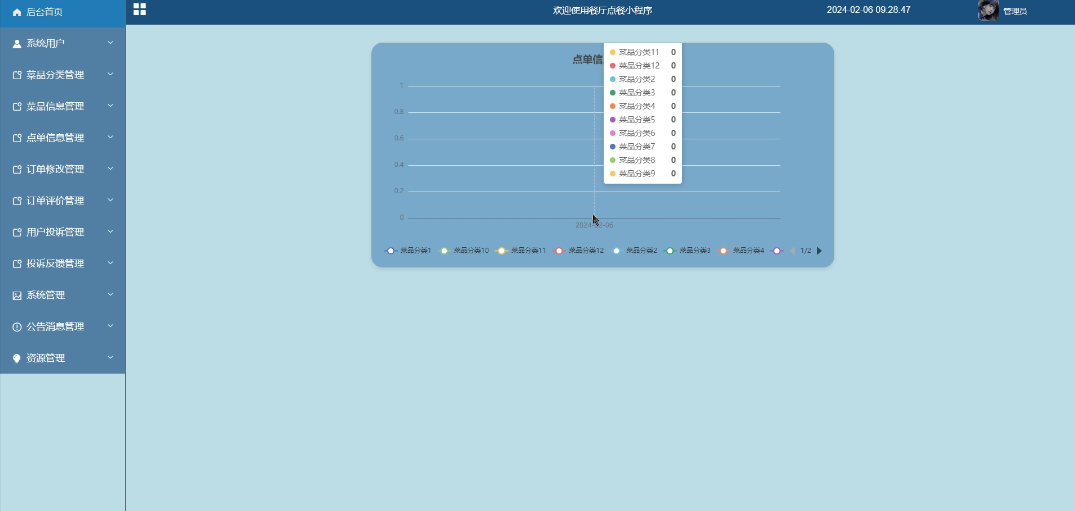 - 菜品分类管理:可查看所有菜品分类信息,进行增改删查操作,支持菜品分类搜索,点击可查看详情。