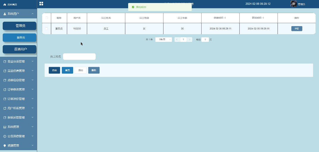 - 系统用户:可对普通用户、服务员和管理员进行管控,包括进行增删改查操作,点击可查看详情,服务员账号信息由管理员添加。