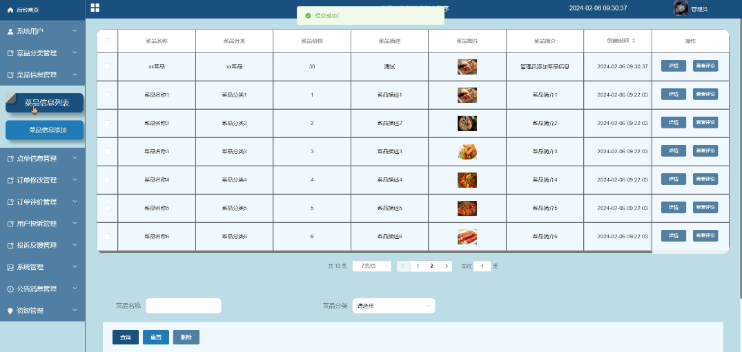 - 菜品信息管理:可查看所有菜品信息,进行增改删查操作,支持菜品名称、菜品分类搜索,可点击查看详情(菜品名称、菜品分类、菜品价格、菜品描述、菜品简介)和查看评论。