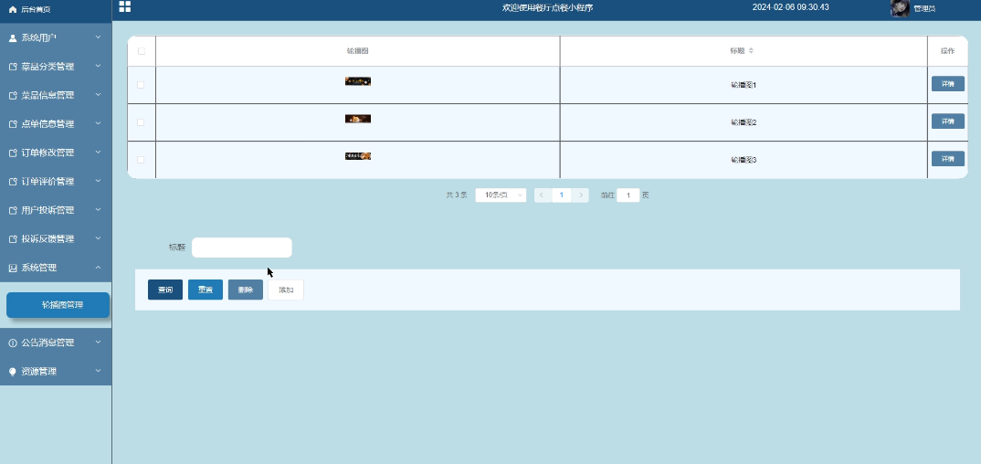 - 系统管理:可对首页的轮播图进行管理,进行增删改查操作,支持标题搜索,可点击查看详情(标题、轮播图)。