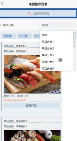 点击“菜品信息”:可查看所有菜品信息,支持菜品名称、菜品分类搜索和点赞数、点击数、发布时间搜索,可点击查看详情,进行点赞、收藏和评论操作,并可点击点单操作