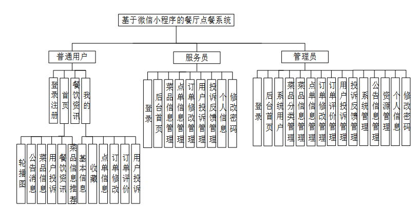 通过对餐厅点餐系统的需求分析,该系统主要分为普通用户、服务员和管理员三大功能模块。具体如下: