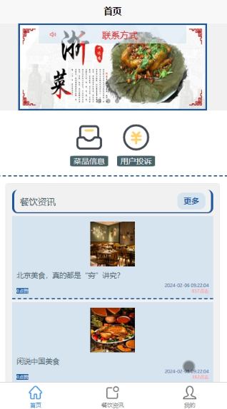 首页:可查看轮播图、公告消息、菜品信息、用户投诉、餐饮资讯、菜品信息推荐和其他系统功能。例如: