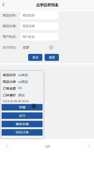 点击“点单信息”,可查看自己的点单信息,支持菜品名称、菜品分类、用户姓名、支付状态搜索,可点击查看详情,并可点击支付、修改申请、评价订单等操作,可选择线上支付或现金支付方式;