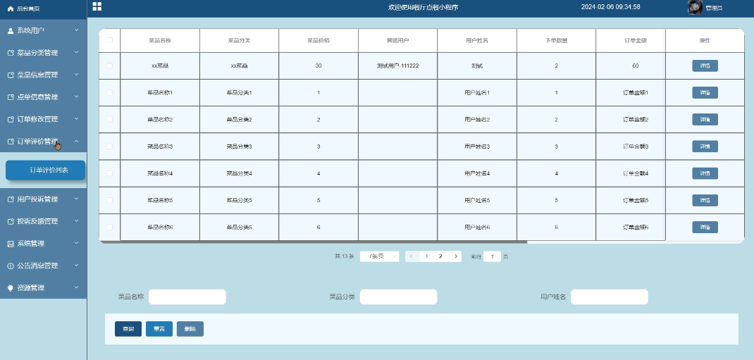 - 订单评价管理:可查看所有订单评价信息,进行查询和删除操作,支持菜品名称、菜品分类、用户姓名搜索,可点击查看详情。