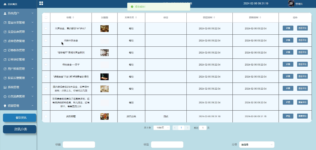 - 资源管理:可对餐饮资讯和资讯分类进行管理,进行增删改查操作,餐饮资讯支持标题、标签、分类搜索,可点击查看详情(封面图、标题、分类、标签、描述、正文)和查看评论;资讯分类支持类型名称搜索。