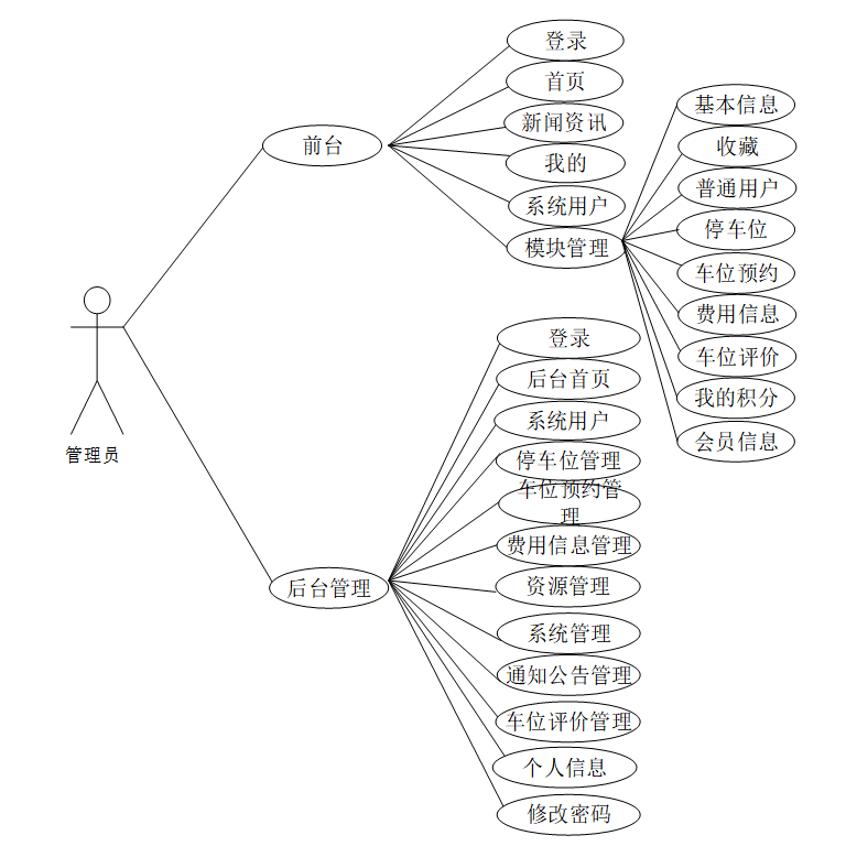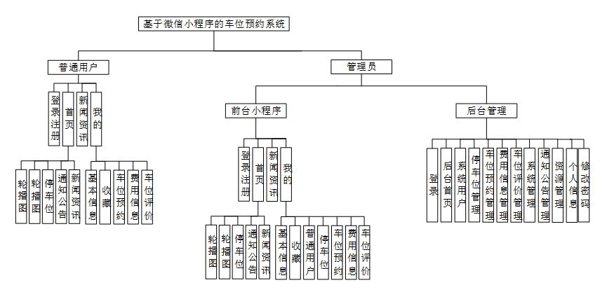 通过对车位预约系统的需求分析,该系统主要分为普通用户、批发商和管理员三大功能模块。具体如下: