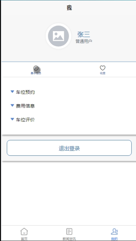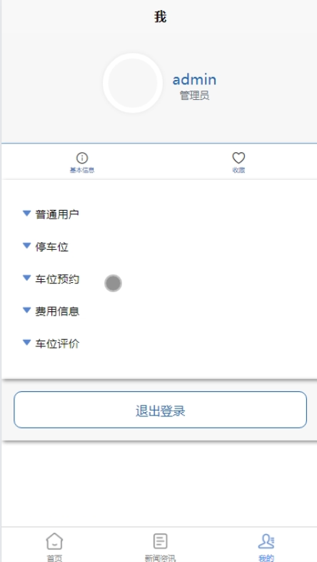 - 我的:可对基本信息、收藏、普通用户、停车位、车位预约、费用信息、车位评价等信息进行管控。具体如下: