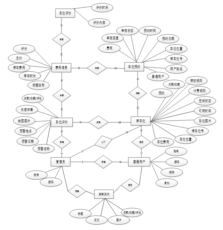 下面是整个车位预约系统中主要的数据库表总E-R实体关系图。