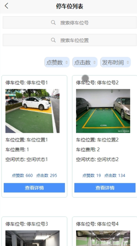- 停车位:点击“停车位”,可查看发布的所有停车位信息,支持停车位号、车位位置搜索和排序(点赞数、点击数、发布时间)搜索,可点击查看详情。
