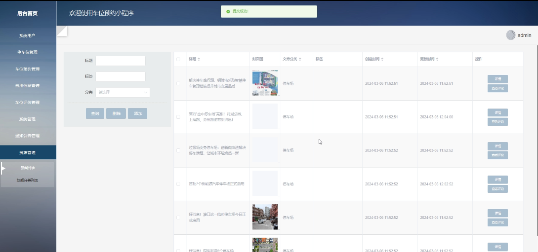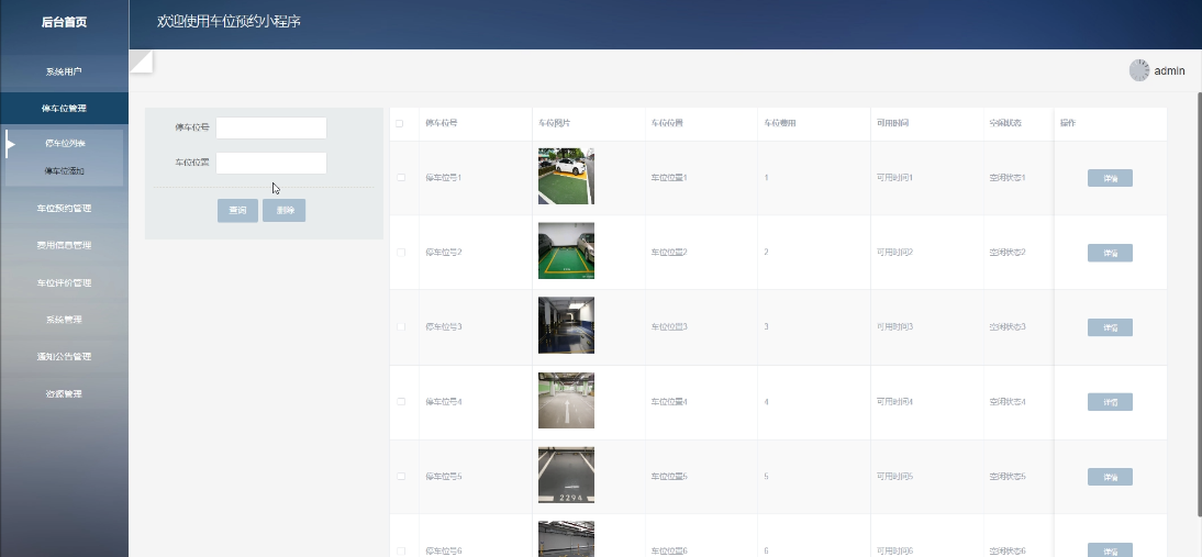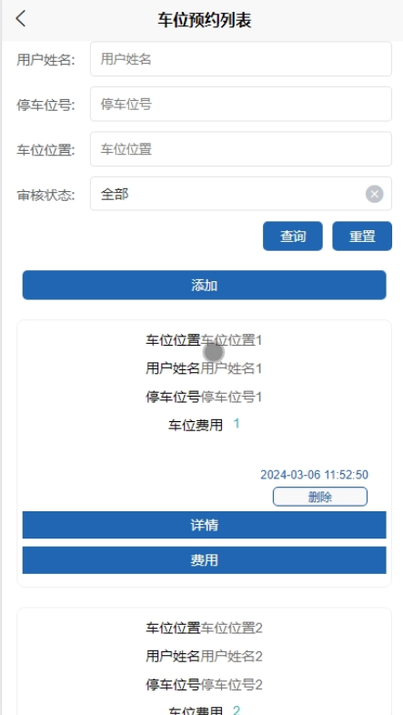 - 车位预约管理:可查看所有提交的车位预约信息,进行增改删查操作,支持用户姓名、停车位号、车位位置、审核状态搜索,可点击查看详情,和进行审核,并可点击费用操作,填写费用信息(停车时长、停车费用)并提交。
