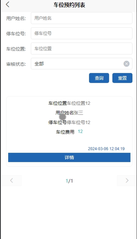 - 车位预约:点击“车位预约”,可查看提交的车位预约信息,进行查询操作,支持用户姓名、停车位号、车位位置、审核状态搜索,可点击查看详情(普通用户、用户姓名、停车位号、车位位置、预约日期、预约时间、审核状态、审核回复)。