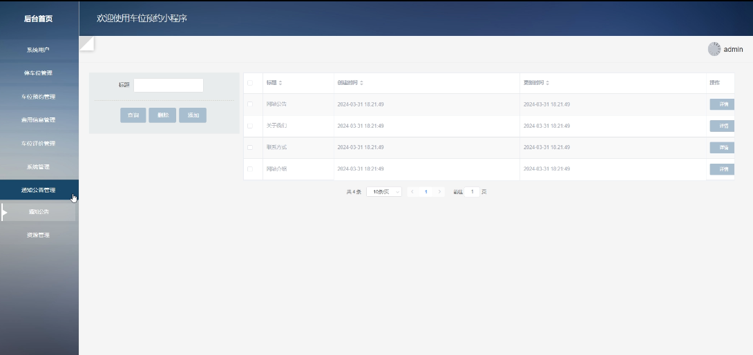 - 通知公告管理:可对通知公告进行管理,进行增删改查操作,支持标题搜索,可点击查看详情。
