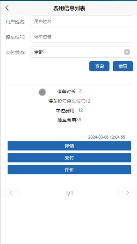 - 费用信息管理:可查看所有提交的费用信息,进行查询操作,支持车库名称、车牌号搜索,可点击查看详情,和点击评价、支付操作。