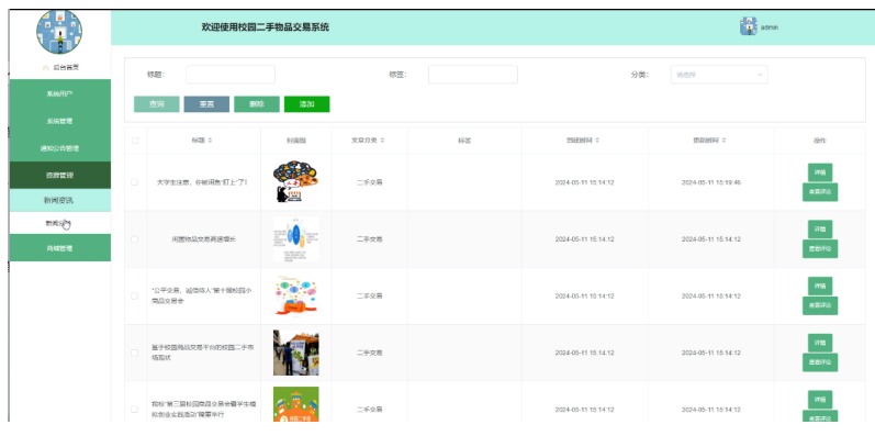 - 资源管理:管理员可以发布、编辑和删除新闻资讯和新闻分类,更新校园生活和二手物品相关的新闻内容。可以设置新闻的展示顺序和分类。