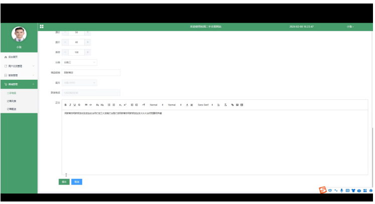 - 商城管理:管理员可以审核和管理用户发布的商品信息,包括审核发布物品、下架违规物品等。可以对物品进行编辑和删除。管理员可以管理物品分类,添加、编辑或删除分类。查看和管理订单,包括订单状态、配送情况等。可以标记订单状态和备注订单相关信息。跟踪和管理订单的配送过程,更新配送状态和提供物流信息。