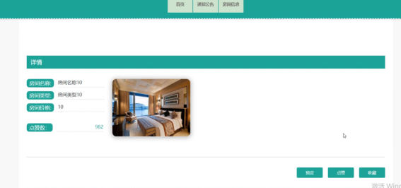 - 房间信息:查看酒店的房间信息,包括:房间名称,房间类型,房间价格和点赞数等信息,也可以在此功能下进行房间的预订操作。
