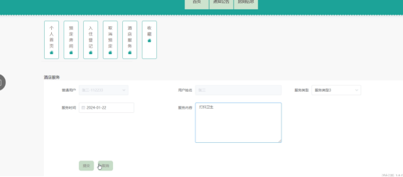 酒店服务:用户可以在此界面机型酒店服务的预约,输入相关信息,包括:服务类型、时间、内容等,点击提交即可。界面如下图所示。