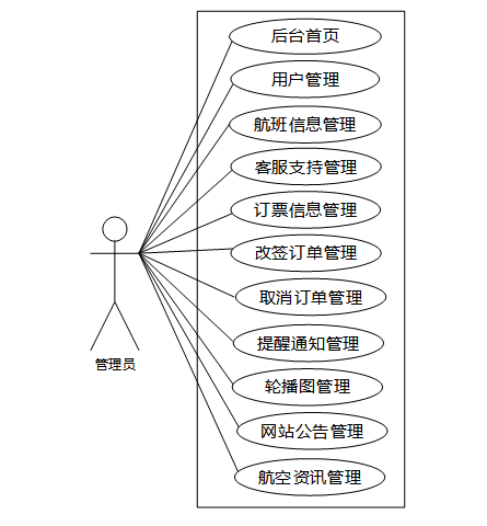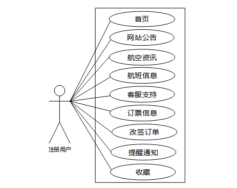 系统用例分析是对系统中各个功能模块的用户需求和行为进行分析,以识别和描述不同的用户用例。通过系统用例分析,可以深入了解用户在平台上的操作流程和交互方式,为系统设计和开发提供指导,并确保平台能够满足用户的需求和期望。机票预订系统中用户角色用例图如图2.1所示: