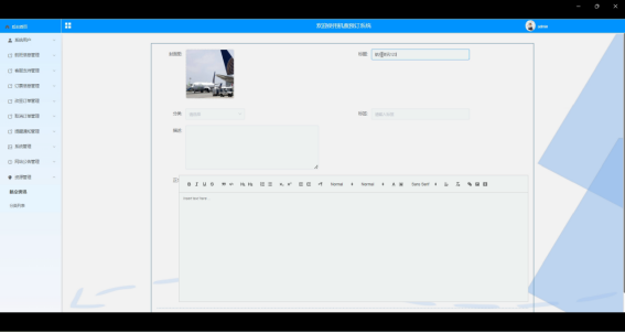 航空资讯管理功能包括发布、编辑、删除航空相关新闻、航班信息等。管理员可登录系统管理航空资讯,包括发布最新行业资讯、航班动态、特别活动等内容。管理员可以编辑已有资讯内容,删除过期或错误信息,确保资讯页面的准确性和实用性。界面如下图所示。
