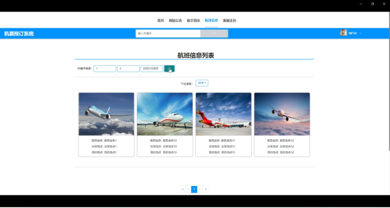 航班订票功能允许用户选择航班、填写乘客信息、选择座位、支付订单。用户登录系统后,浏览航班信息并选择合适航班,填写乘客信息并选择座位,完成订单支付。系统验证信息准确性,生成电子票并发送确认信息。界面如下图所示。