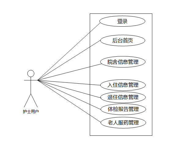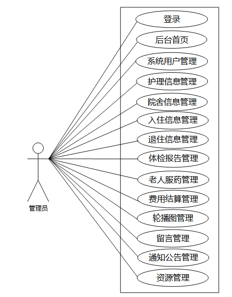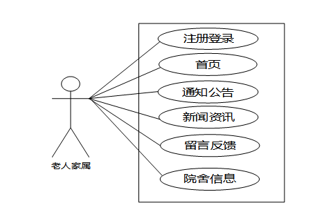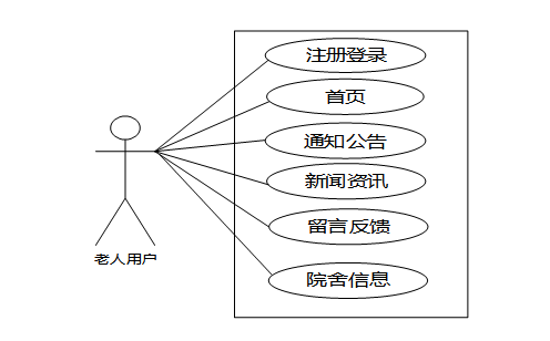 系统用例分析是对系统中各个功能模块的用户需求和行为进行分析,以识别和描述不同的用户用例。通过系统用例分析,可以深入了解用户在系统上的操作流程和交互方式,为系统设计和开发提供指导,并确保平台能够满足用户的需求和期望。养老院管理系统中老人用户角色用例图如图2.1所示: