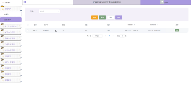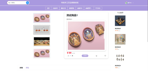 The traditional handicrafts sales system developed this time is a special platform for selling traditional handicrafts online based on the current Internet plus era. The project is mainly composed of two parts, the front and the back. The users of the two parts are different. The front is used by the vast number of users who need to buy traditional handicrafts, and the back is used by the program administrator, Users can engage in a series of activities such as browsing products, registering and logging in, adding intended products to shopping carts, and paying for purchases in the front-end. Administrators can manage users, products, product categories, and front-end user orders in the back-end. The application of this project can help traditional handicrafts keep pace with the development of the times, not be eliminated, and enhance the competitiveness of traditional handicraft merchants.