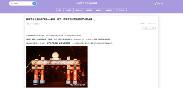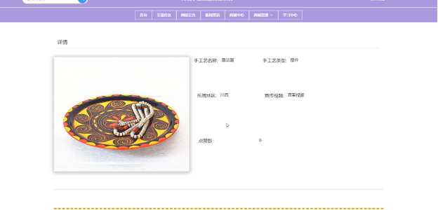 当用户点击前台“学习中心”按钮后可以查看学习中心信息,了解包括手工艺名称、手工艺类型、所属地区、宣传视频、代表作品、详情等信息。学习中心详情界面如下图4-11所示。