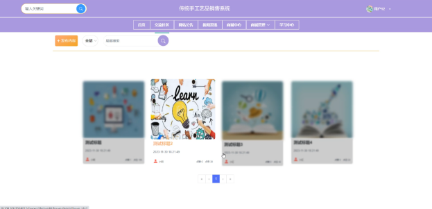 用户点击传统手工艺品销售系统中导航栏上的“交流社区”后将会进入到该“交流社区”列表的界面,然后选择想要看的交流社区,点击进入到详细界面,在详细界面可以收藏+赞+评论等操作。也可以点击发布内容发布新的交流帖子。交流社区列表界面如下图4-6所示。