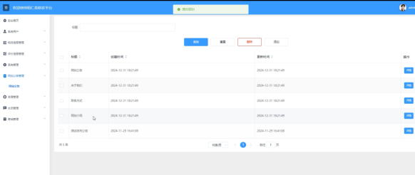 管理员可以发布网站公告,通知用户平台的最新动态、活动安排、政策变动等信息。管理员还可以编辑、删除或修改已发布的公告,确保公告内容的时效性和准确性。网站公告管理界面如下图5-12所示。