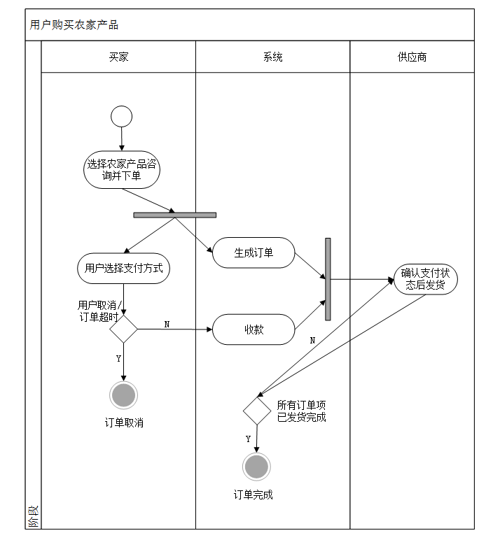 供应商用户具备登录、后台首页、物流信息管理、评价信息管理、商城管理(农家产品、分类列表、订单列表、订单配送、订单售后)等需求用例。