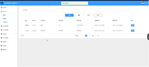管理员可以对平台上的所有用户进行管理,包括执行增、删、改、查操作。管理员可以添加新用户、删除不活跃或违规的用户、修改用户信息(如姓名、联系方式、密码等),并为用户设置不同的权限角色,如普通用户、供应商或管理员,以确保各类用户只能访问与其角色相符的功能。例如,管理员可以通过代码更新用户信息:userRepository.save(user);,或为用户设置角色:user.setRole("SUPPLIER"); userRepository.save(user);。这些功能有助于管理员高效管理平台用户,确保平台的安全性和良好的运营秩序。系统用户管理界面如下图5-8所示。