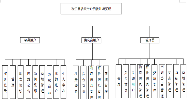 桓仁县助农平台包含普通用户、管理员和供应商用户三大角色,主要功能如下: